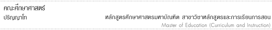 ชื่อเต็ม (ไทย) : ศึกษาศาสตรมหาบัณฑิต (หลักสูตรและการเรียนการสอน) ชื่อย่อ (ไทย) : ศษ.ม. (หลักสูตรและการเรียนการสอน) ชื่อเต็ม (อังกฤษ) : Master of Education (Curriculum and Instruction) ชื่อย่อ (อังกฤษ) : M.Ed. (Curriculum and Instruction)