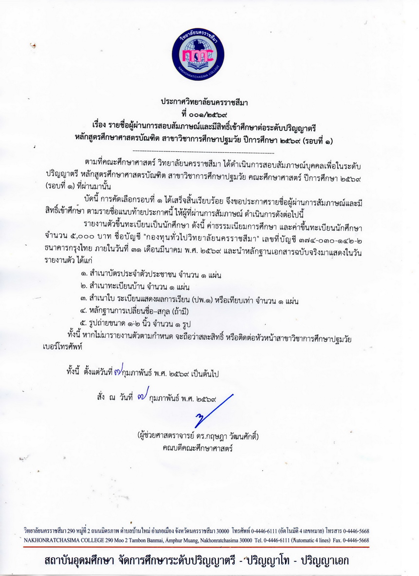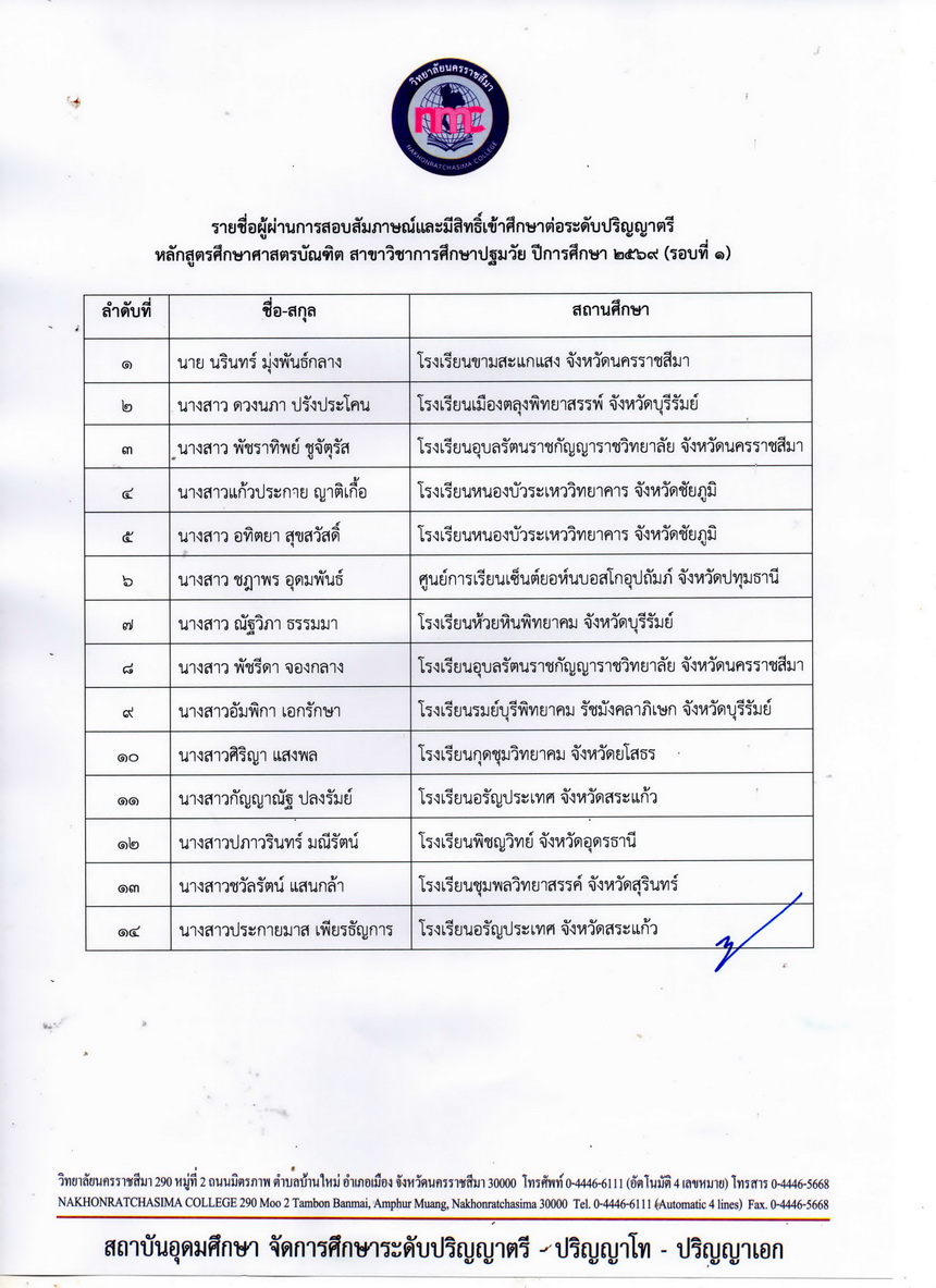 | เรื่อง : ประกาศรายชื่อผู้ผ่านการสอบสัมภาษณ์และมีสิทธิ์เข้าศึกษาต่อระดับปริญญาตรี หลักสูตรศึกษาศาสตรบัณฑิต สาขาวิชาการศึกษาปฐมวัย ปีการศึกษา ๒๕๖๙ (รอบที่1) |